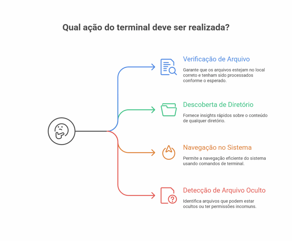 Outro cenário clássico: Você recebe uma dica ou comando para executar um script em uma pasta. Antes de rodar sem ver nada, é sempre bom dar um ls na pasta e entender exatamente tudo que tem ali (inclusive arquivos ocultos ou backups que você pode nem notar no ambiente gráfico).
