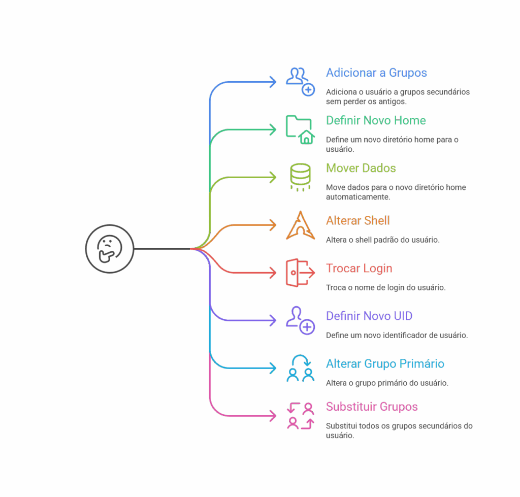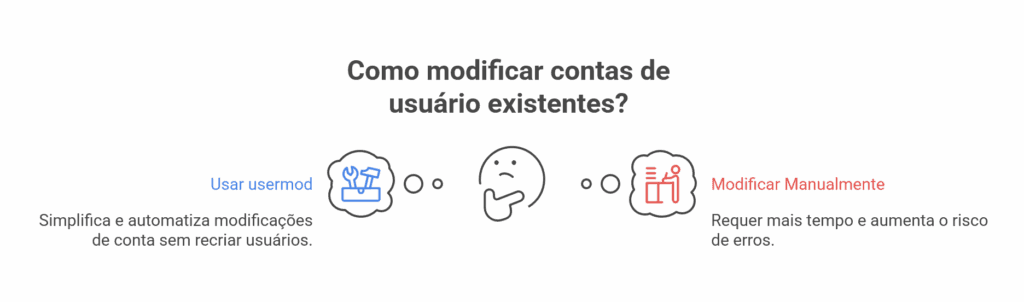 O usermod é o comando recomendado para realizar todas essas mudanças de maneira simples, segura e flexível, sem a necessidade de excluir e recriar usuários.