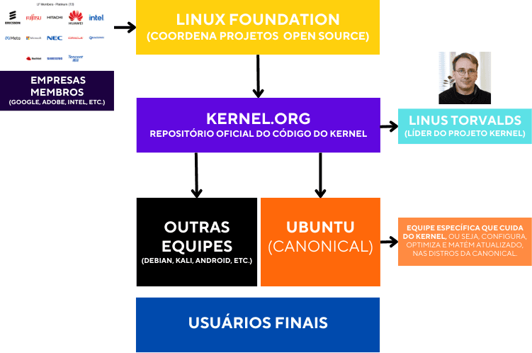 Antes de entender como o KERNEL LINUX funciona é importante entender como a estrutura de desenvolvimento do kernel funciona, o Linus Torvalds que é o líder do projeto, só liberada para o público (qualquer um pode baixar), após sua revisão final.