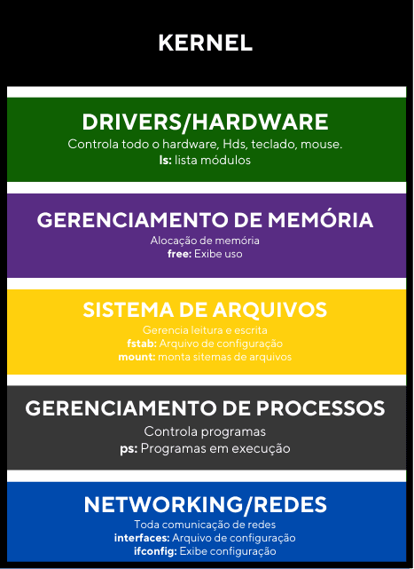 interface com drivers e dispositivos/sys/class/dispositivos por classe/sys/block/dispositivos de bloco (discos)/sys/bus/baramentos (PCI, USB, SCSI)/sys/devices/árvore de dispositivos/sys/kernel/parâmetros do kernel/sys/module/parâmetros dos módulos/sys/power/controle de energia/sys/firmware/interface com BIOS/UEFI📂 Outros diretórios do kernel