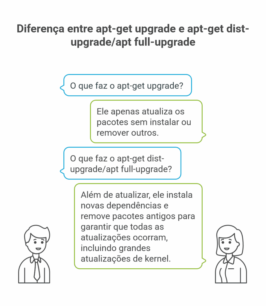 Recomenda-se usar upgrade para tarefas de rotina, e full-upgrade/distr-upgrade antes de grandes atualizações ou após mudanças de repositório.