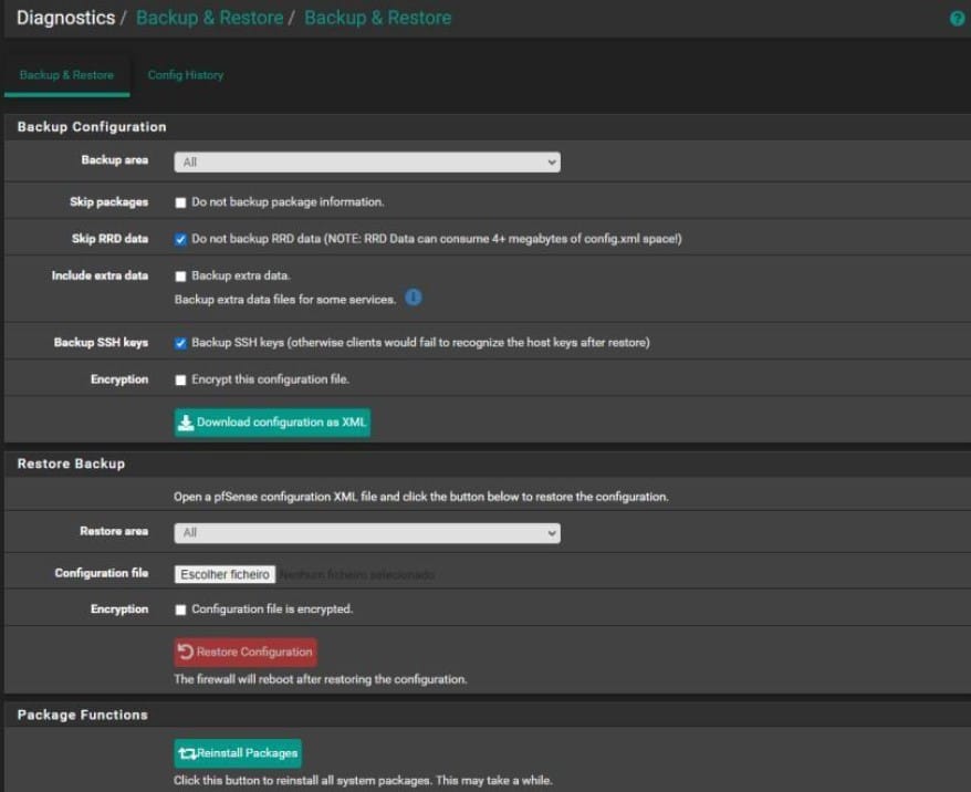 - Diagnóstico > Backup & Restore: Faça o backup completo das configurações do pfSense. Isso é importante para garantir que você possa restaurar a configuração em caso de falhas.