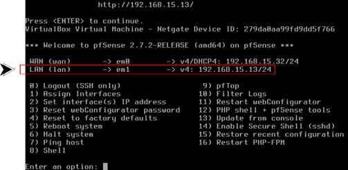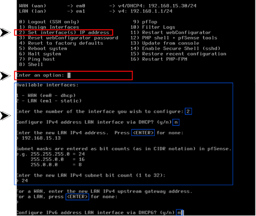 - Tecle 2 novamente para selecionar a interface LAN (em1)