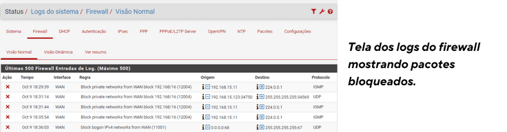 Exemplo: Se você está tentando identificar se uma regra de firewall está bloqueando tráfego indesejado, basta acessar a aba Firewall e verificar os pacotes bloqueados ou permitidos.