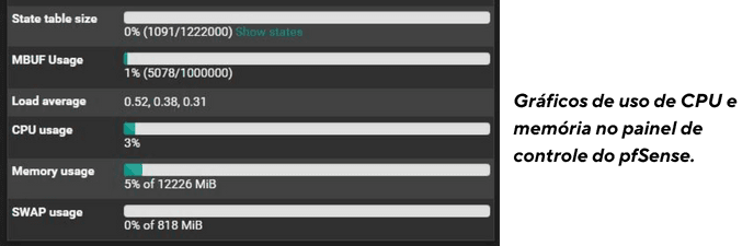 O desempenho do firewall também pode ser impactado pelo uso excessivo de CPU ou memória. No pfSense, você pode monitorar esses recursos em tempo real para garantir que o sistema esteja operando dentro dos limites ideais.