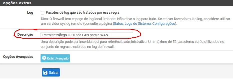 - Descrição: Adicione uma descrição para a regra, como “Permitir tráfego HTTP da LAN para a WAN”.