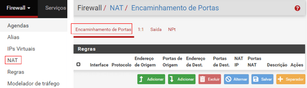 - Firewall > NAT > Encaminhamento de portas
