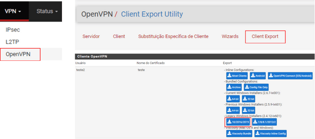 - VPN > Client Export: Pacote/Módulo instalado