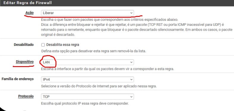- Ação: Selecione LIBERAR para permitir o tráfego.