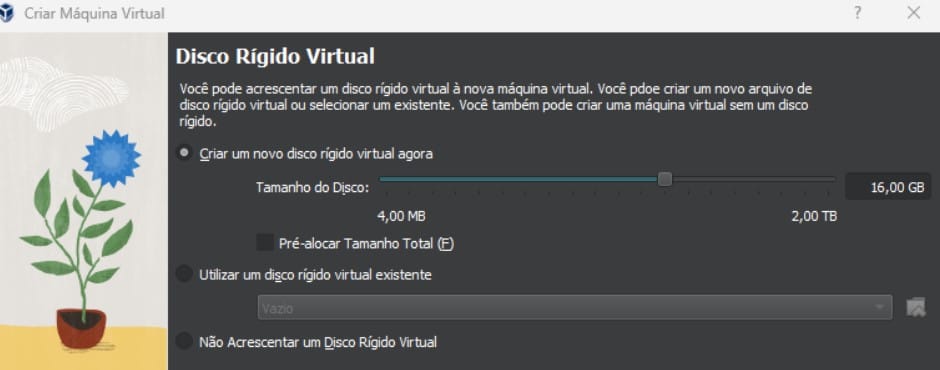 Agora definiremos a quantidade de disco destinado ao pfSense. Por padrão o VirtualBox define 16GB, porém esse armazenamento será ocupado conforme a maquina crescer e precisar de mais recursos. Então nós estamos basicamente definindo um limite de crescimento pra essa máquina.