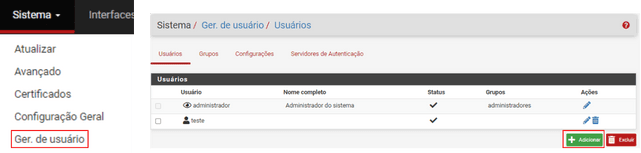 - Sistema > Ger. de Usuário > Adicionar: Nome e senha