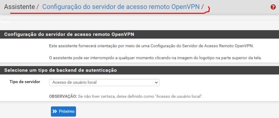 - VPN > OpenVPN > Wizards: E siga o assistente para configurar uma VPN do tipo OpenVPN. Esse assistente guiará você pelas etapas de criação de certificados e configuração do servidor.