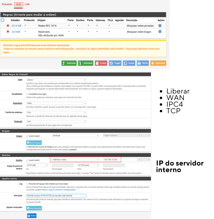 Vamos permitir o tráfego HTTP (porta 80) e HTTPS (porta 443) para um servidor web interno que tem o IP 192.168.15.100
