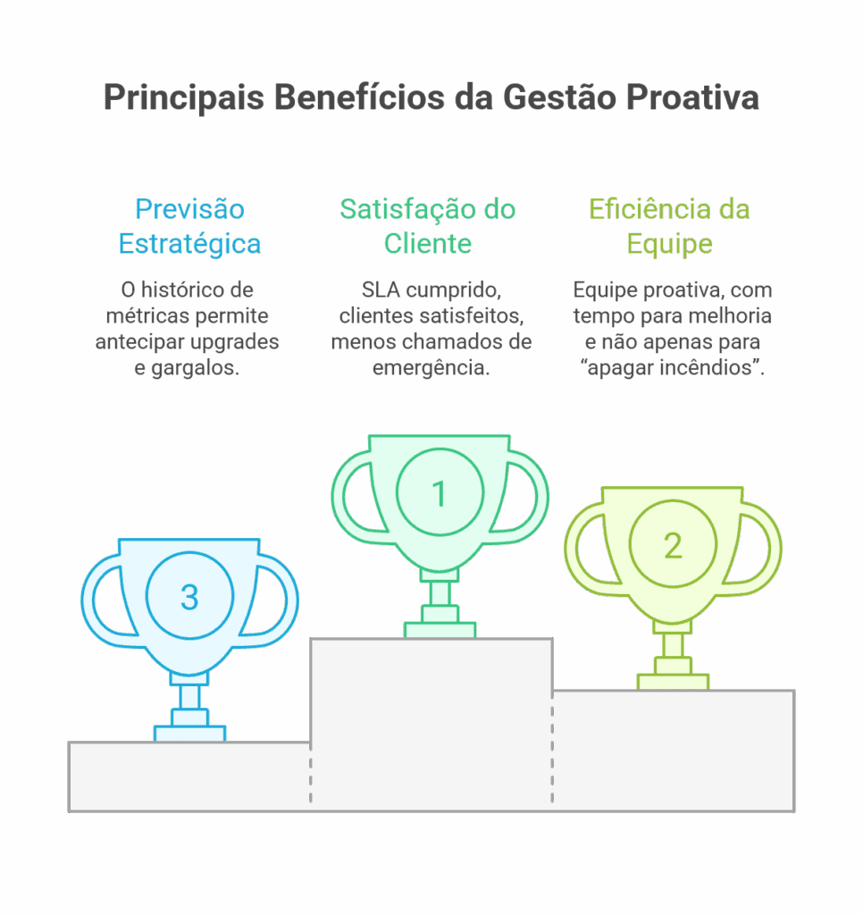 - SLA cumprido, clientes satisfeitos, menos chamados de emergência.