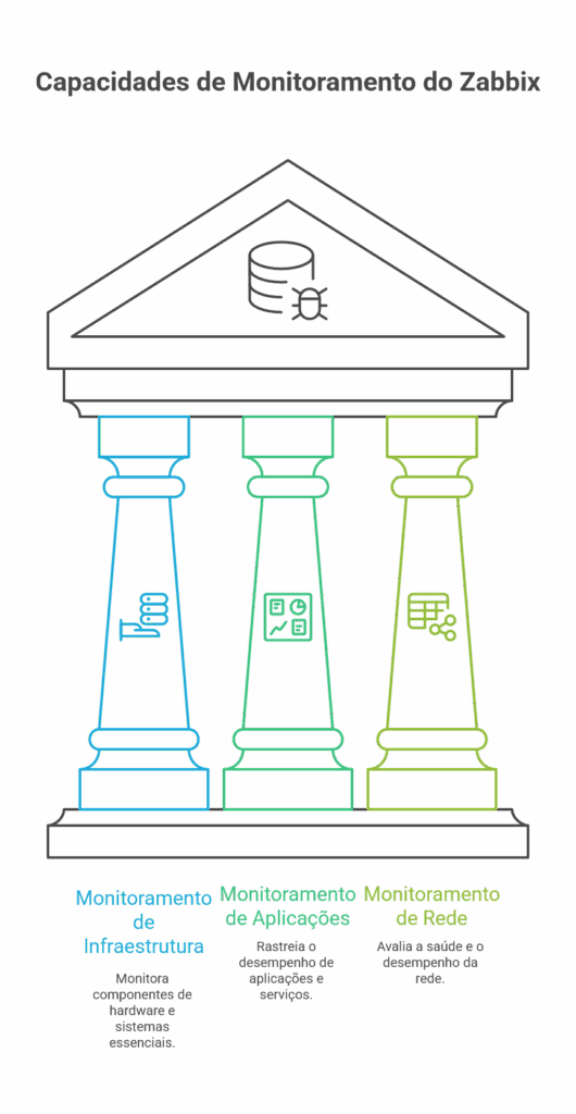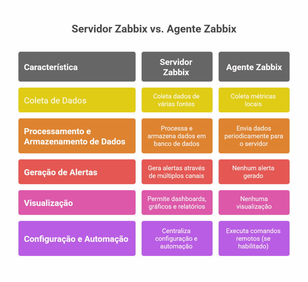 A arquitetura do Zabbix foi desenhada para ser flexível e eficiente. O funcionamento básico é dividido em Zabbix Server e Zabbix Agent: