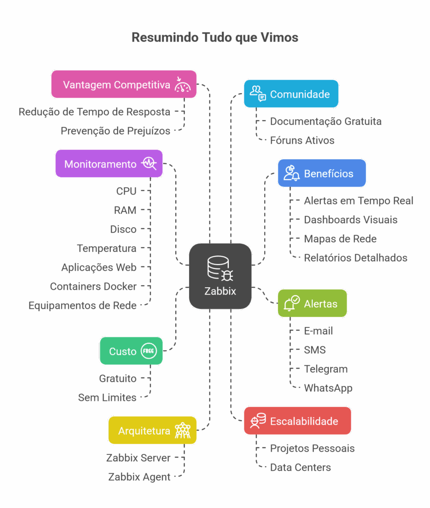 Com o Zabbix, você não só enxerga todos os detalhes da cidade em lindos painéis de controle (dashboards), como também pode agir rápido, organizar sua equipe e se antecipar a problemas. Seja para uma cidadezinha menor (seu projeto pessoal), uma metrópole (empresa grande) ou um complexo inteiro (data center), o Zabbix centraliza e simplifica o monitoramento, tornando a gestão muito mais eficiente.